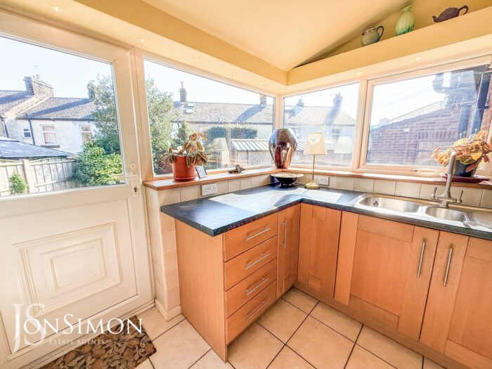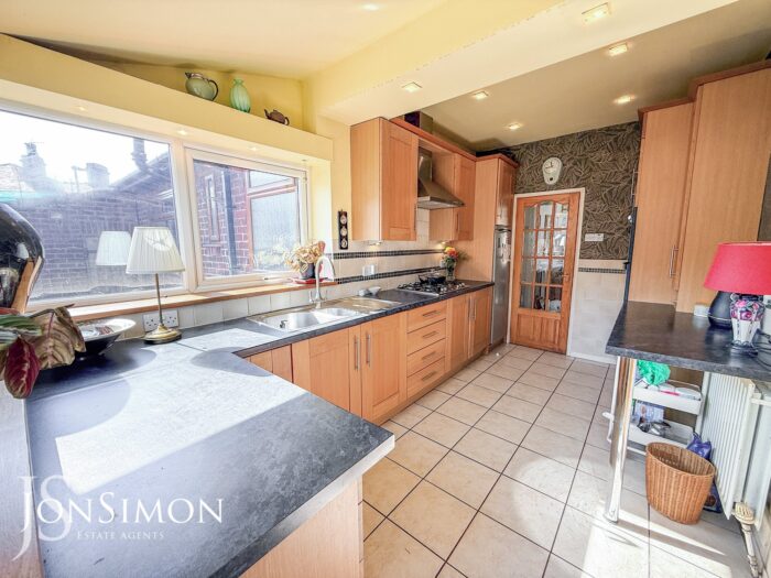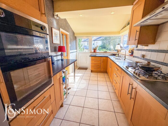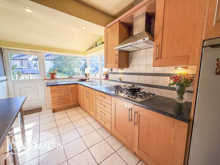 Range of wall and base units with complementary work surface, five ring gas hob with extractor unit above, gas double oven, one and a half bowl sink unit with drainer, freezer, tiled walls, tiled flooring, breakfast bar, ceiling spotlights, UPVC double glazed rear and side window windows and UPVC double glazed back door.