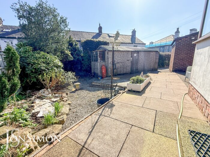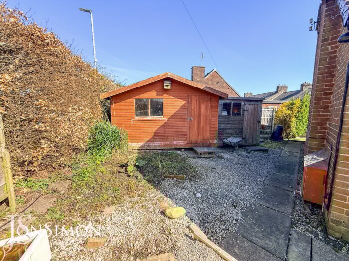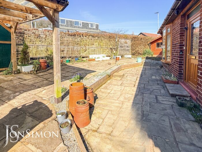 Front: A flagged driveway providing off-road parking, low maintenance garden with paved area and well established borders and shrubs, pergola, two large wooden sheds and pebbled borders.