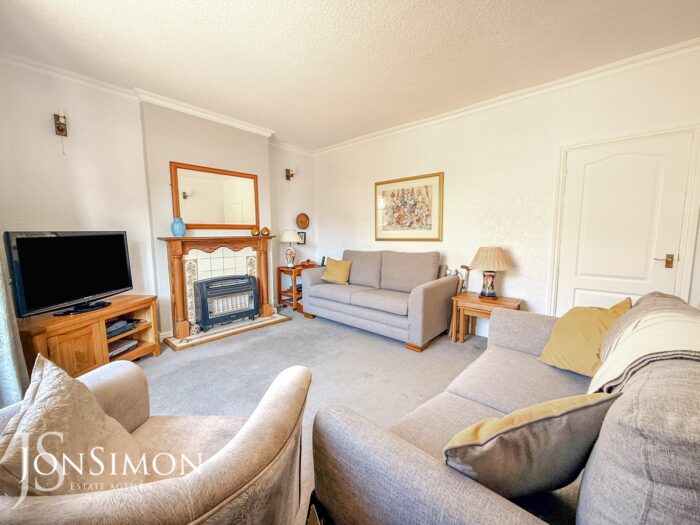 UPVC double glazed bay fronted window, radiator, gas fire with feature surround, wall lights, ceiling coving and TV point.