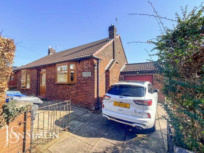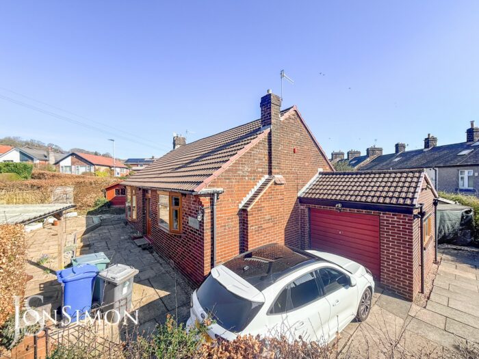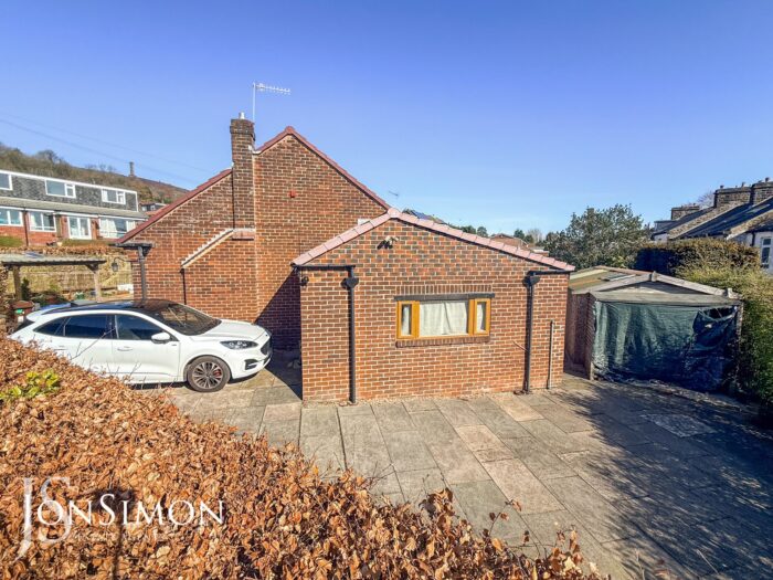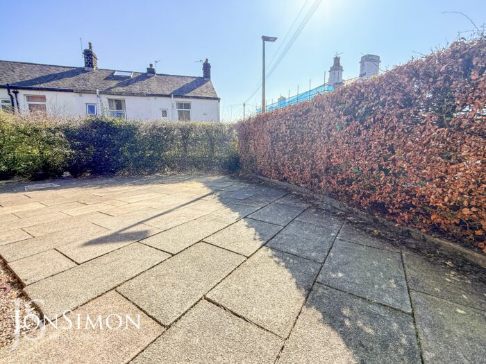 Side: Large flagged driveway for additional off-road parking.