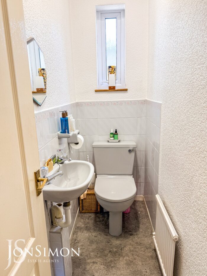 A two-piece suite comprising of a low-level WC, wash hand basin, tiled walls, radiator, ceiling coving, ceiling point and UPVC double glazed rear window.
