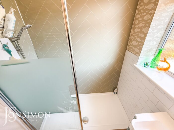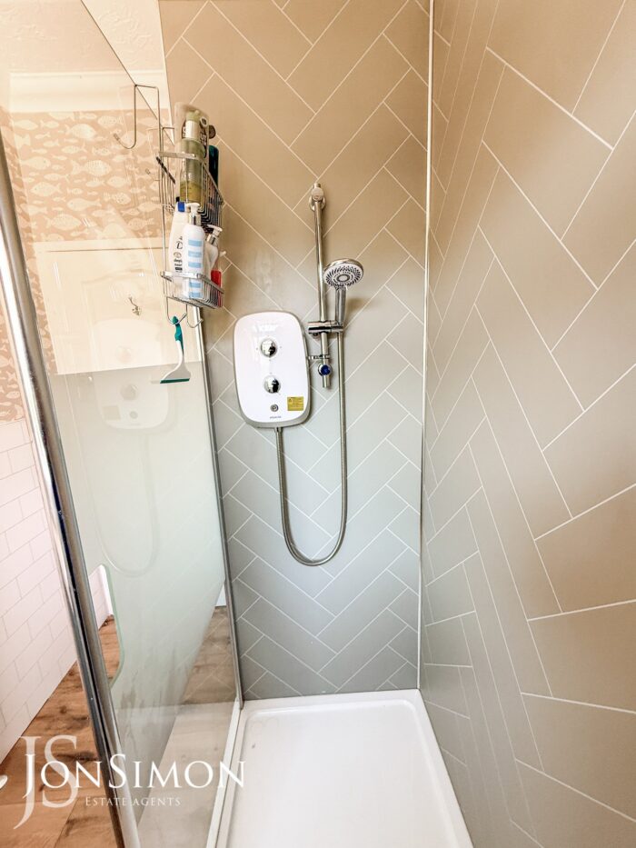 A modern two-piece suite comprising of a large with electric shower, wash hand basin with storage cupboard underneath, towel radiator, extractor unit, storage cupboard, electric wall, ceiling coving, ceiling point and UPVC double glazed rear window.