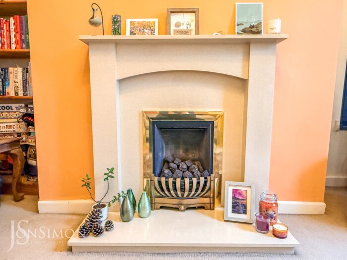 UPVC double glazed front window, gas coal effect fire with feature surround, TV point, meter cupboard, wall lights and ceiling point.