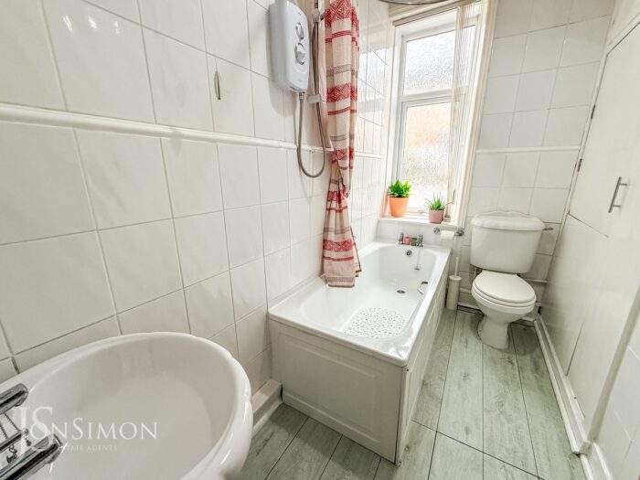 A three-piece white bathroom comprising of a panel bath with mixer taps, electric shower above, low level WC, wash hand basin, radiator, fully tiled walls, laminate flooring, storage cupboard housing the combi boiler, ceiling point and UPVC double glazed rear window.