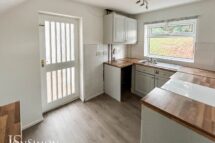 Range of wall and base units with complimentary worksurface, single bowl sink unit with drainer, part tiled walls, washing machine, gas cooker with four ring gas hob, Combi boiler, breakfast bar, storage cupboard, ceiling point, UPVC double glazed rear window and side door.