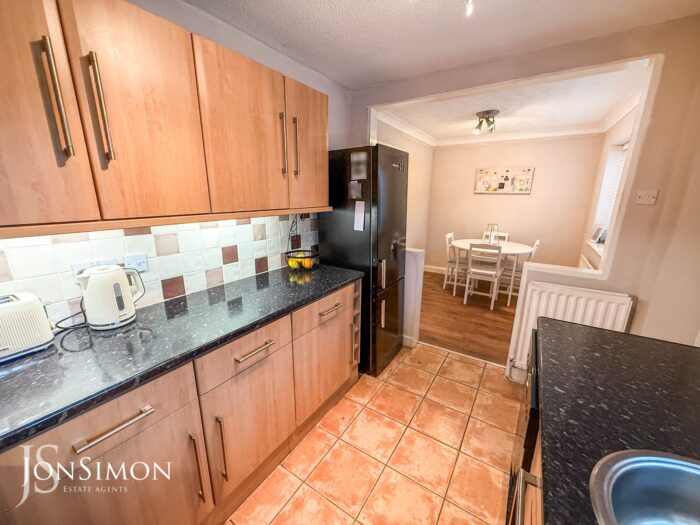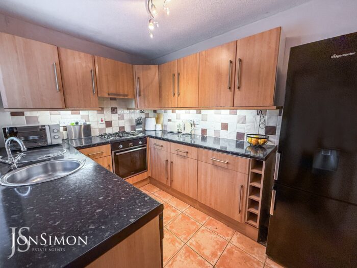 A range wall and base units with complementary worksurface, single bowl sink unit with drainer, four ring gas hob with extractor unit above, electric oven, plumbed for dishwasher, part tiled walls, ceiling point, radiator, tiled flooring, ceiling point and UPVC double glazed rear window.