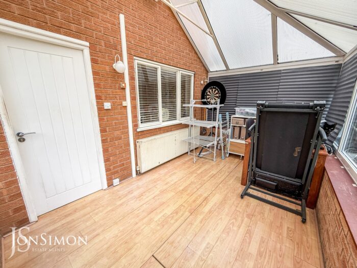 UPVC double glazed front window, coal effect modern fire with feature surround, TV point, radiator, large storage cupboard, ceiling coving, Karndean flooring and ceiling point.