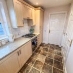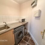 Base unit with complementary worksurface, single bowl sink unit with drainer, plumbed for washing machine, part tiled walls, tiled flooring, radiator, extractor unit and ceiling point.