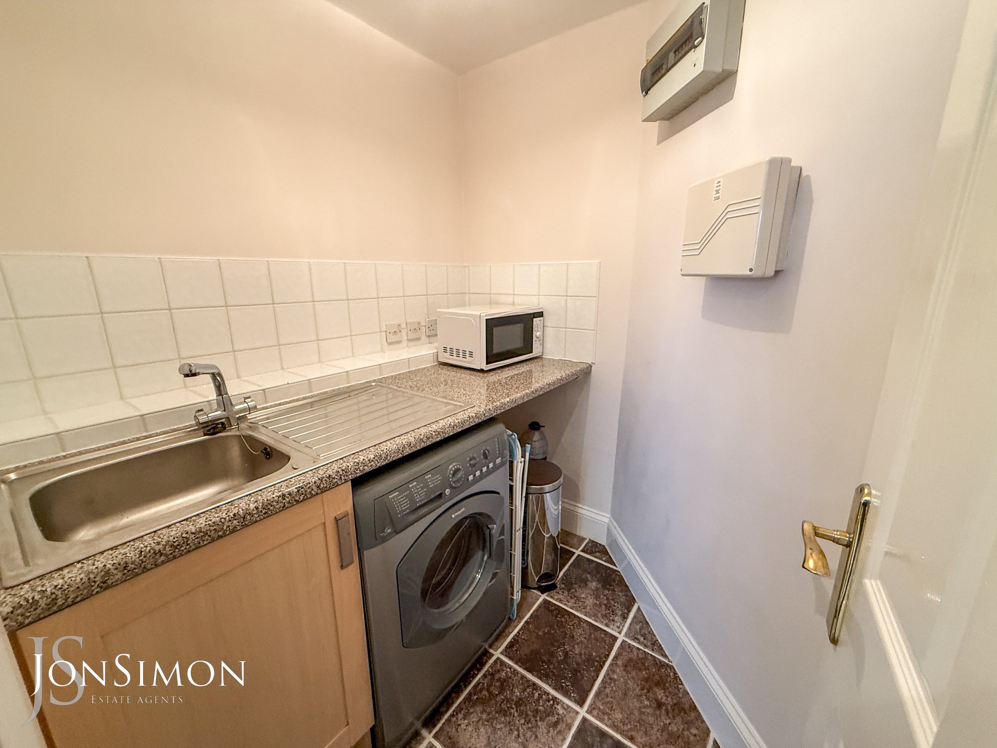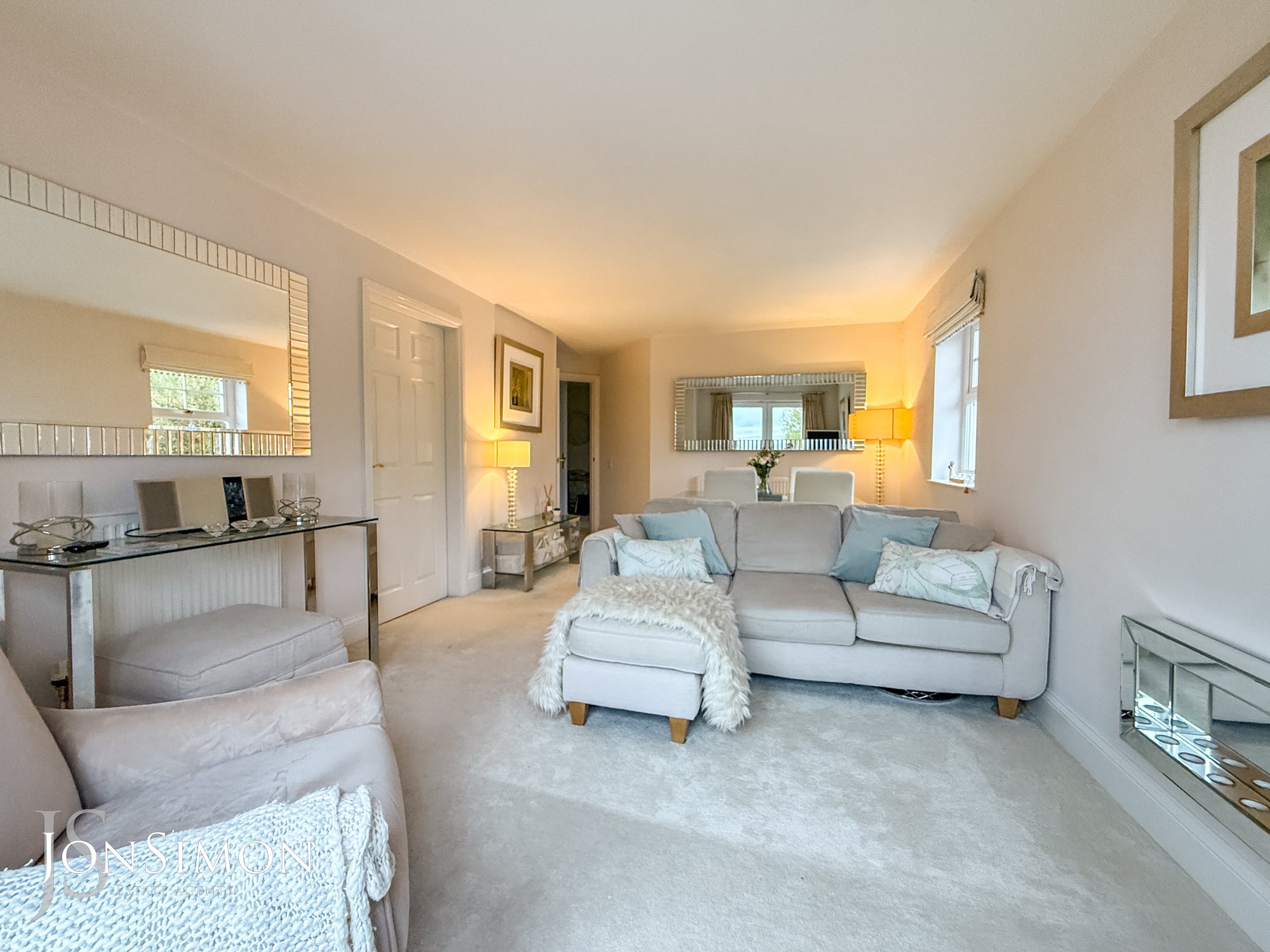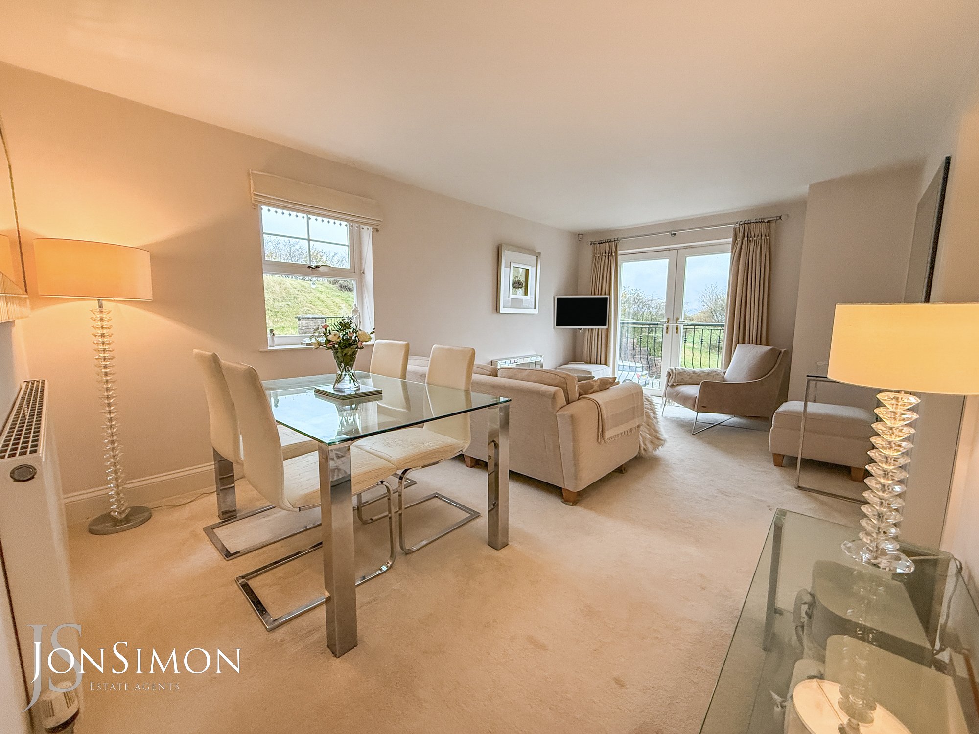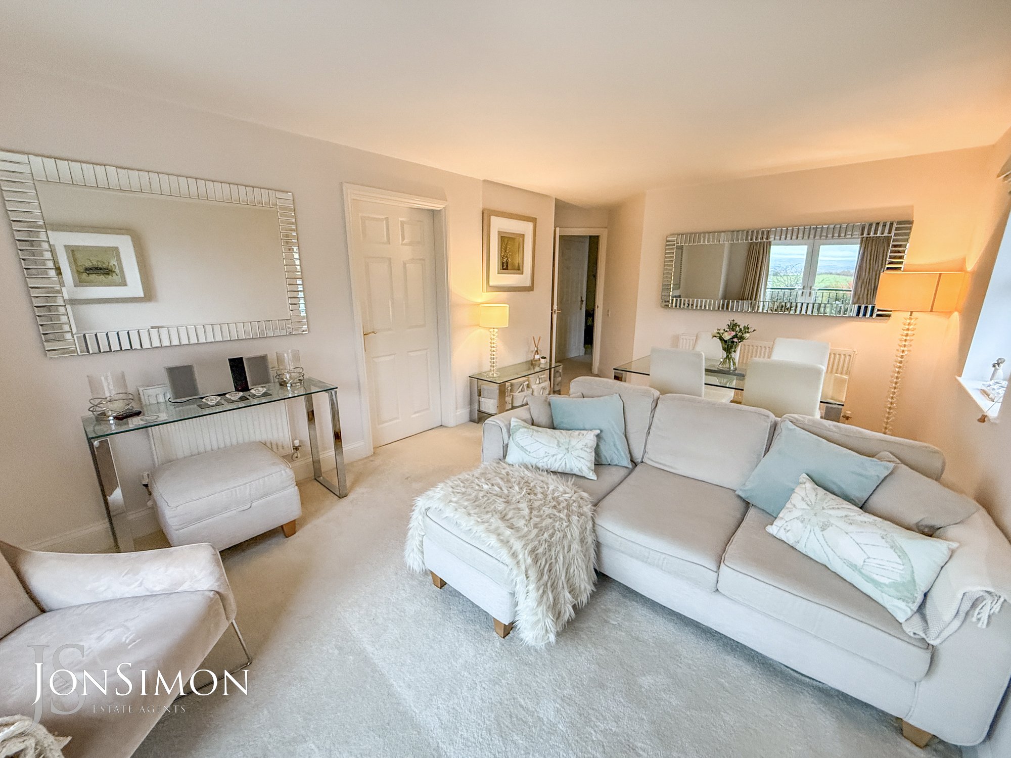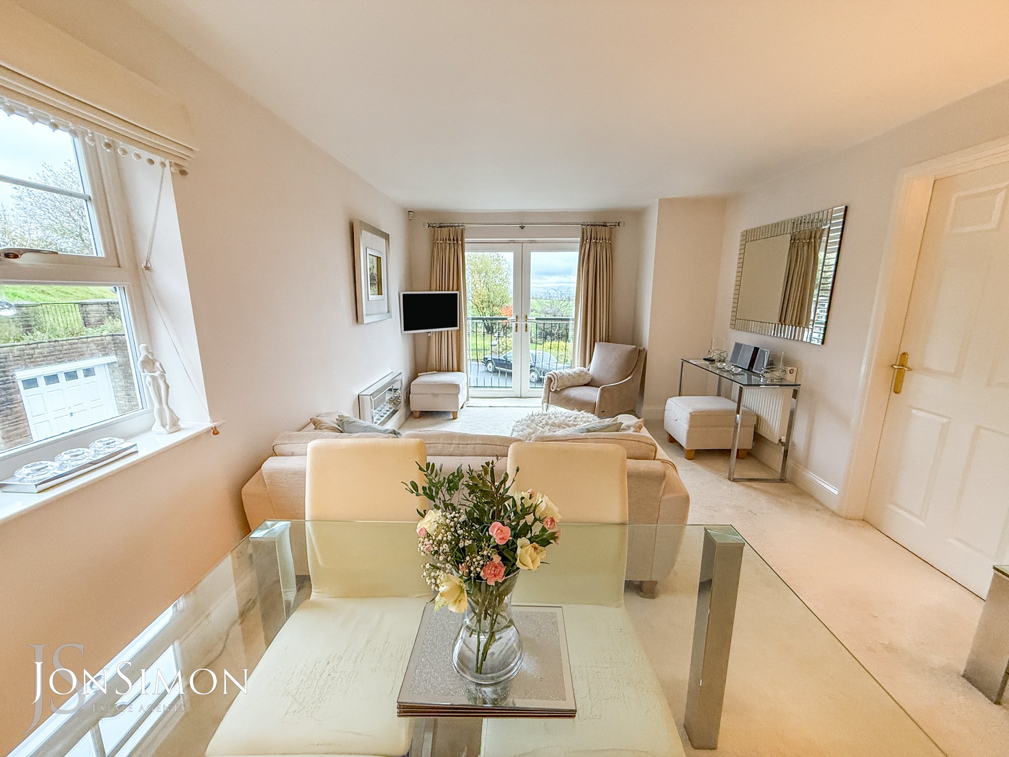 The apartment offers deceptively spacious and versatile living accommodation, briefly comprising an entrance hall, a large lounge/dining area with a Juliette balcony, a modern fitted breakfast kitchen, utility room, two generous double bedrooms, and a stylish three-piece bathroom. The property further benefits from gas central heating and double glazing throughout. Set within beautifully maintained communal grounds of this prestigious development, residents enjoy views across open countryside and towards Manchester’s skyline. On entering the development, a central water feature welcomes you, surrounded by visitor parking and landscaped gardens that flow around the site. The apartment also includes a single garage and an allocated parking space. Viewing is highly recommended and strictly by appointment only via our Ramsbottom office.