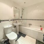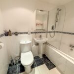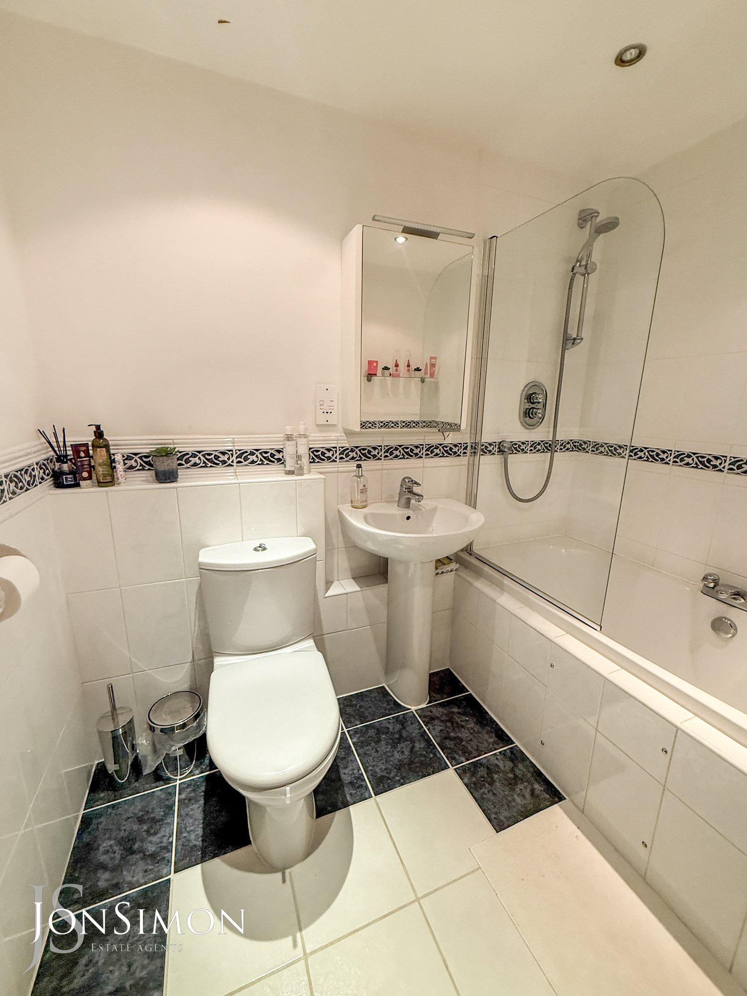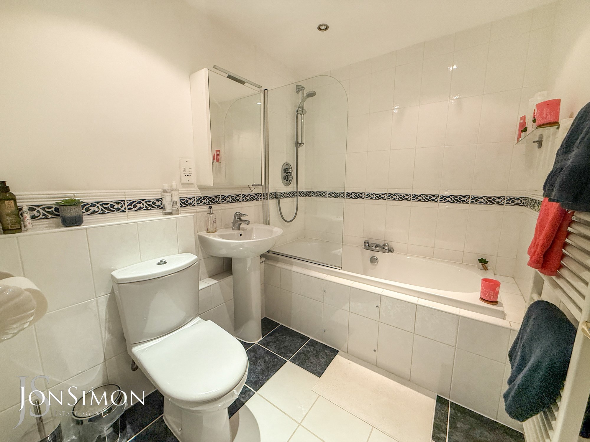 A modern three-piece white suite comprising of a tiled bath with mixer tap, shower above with glass shower screen, low level w/c, wash hand basin, towel radiator, part tiled walls and flooring, shaver point, wall mounted mirror, extractor unit and ceiling spotlights.