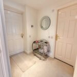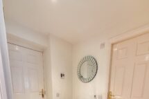 Ceiling spotlights, intercom system and large storage cupboard housing a radiator wash hand basin, extractor unit, ceiling spotlights and loft access.