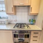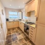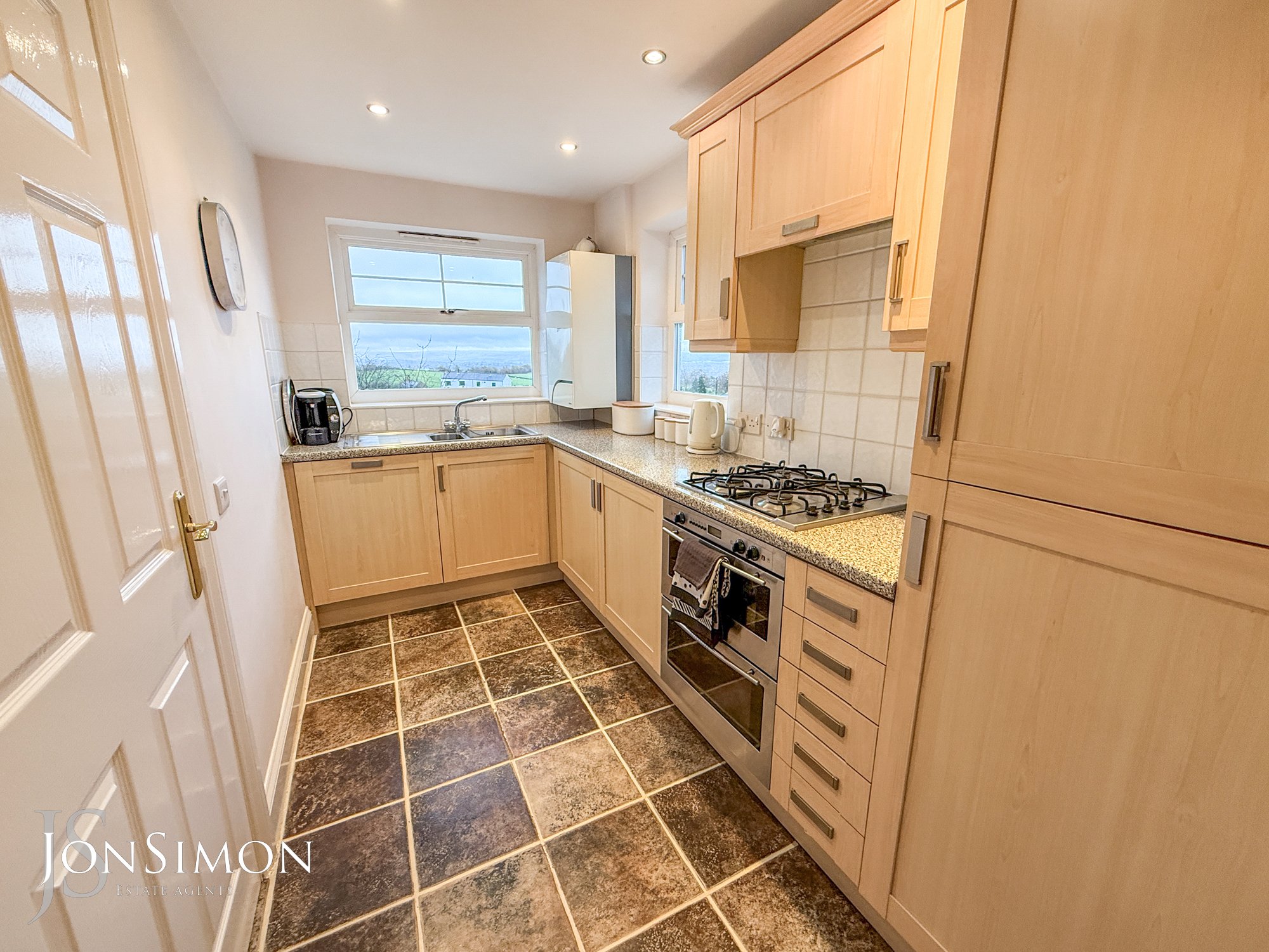 A modern range of wall and base units with complementary surface, four ring gas hob with extractor unit above, double electric oven, single bowl sink unit with drainer, integrated fridge, freezer and dishwasher, radiator, part tiled walls, boiler, tiled flooring, ceiling spotlights, double glazed front and side windows.