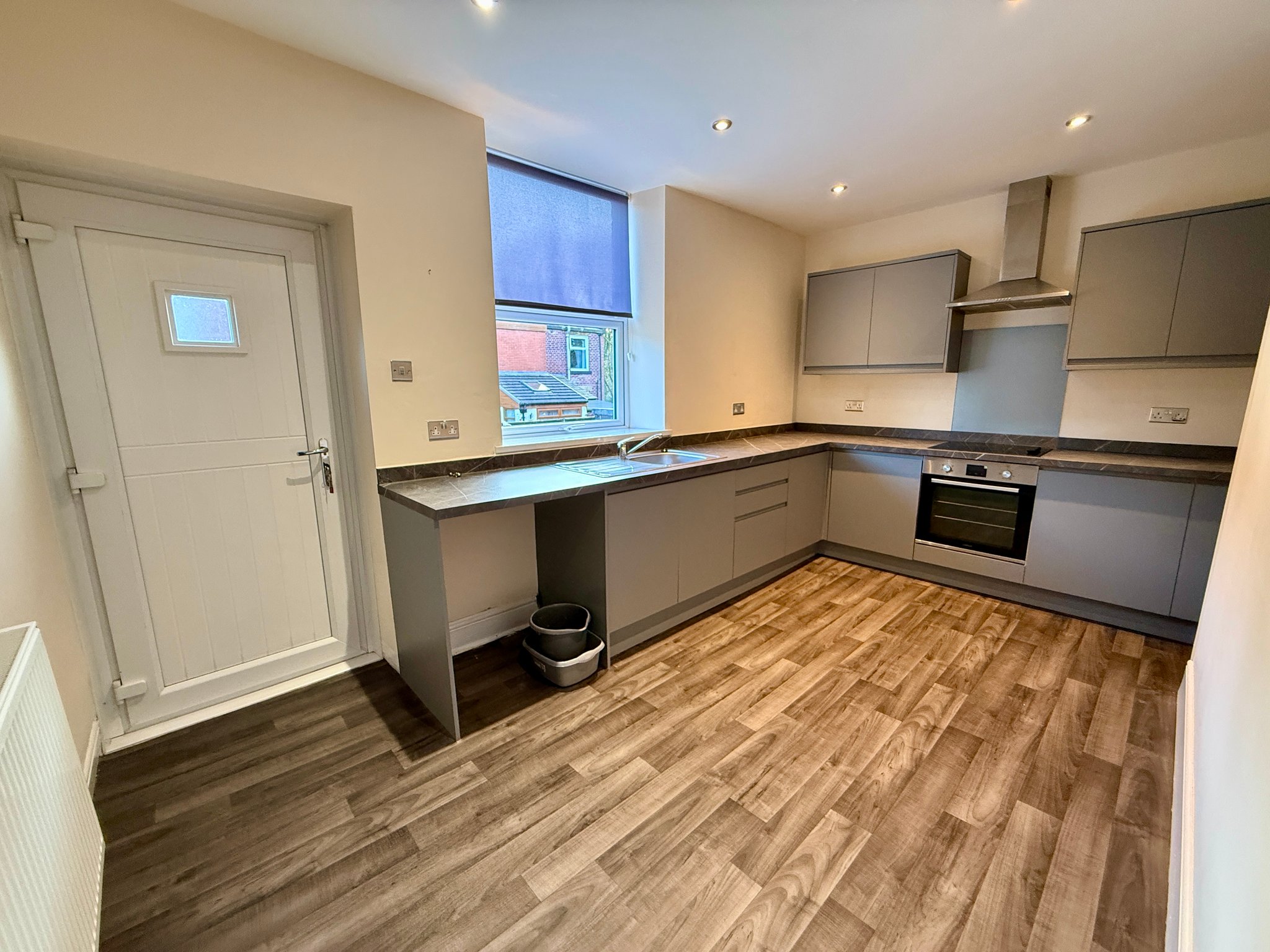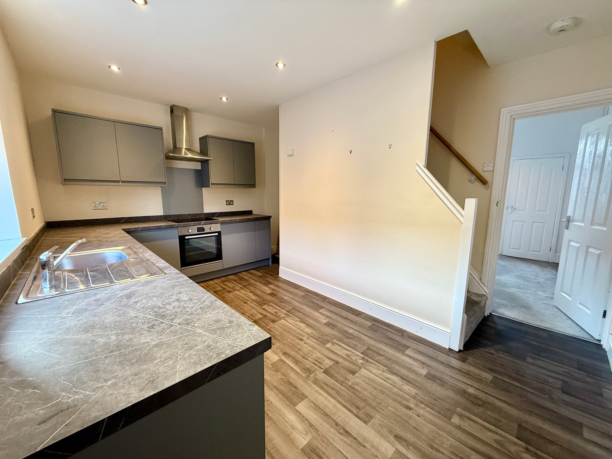 A modern fitted kitchen with a range of wall and base units with complementary worksurface, four ring electric hob with extractor unit above, electric oven, plumbed for washing machine, under stairs steps leading to the cellar, single bowl sink unit, ceiling spotlights, radiator, UPVC double glazed rear window and UPVC double glazed rear door.