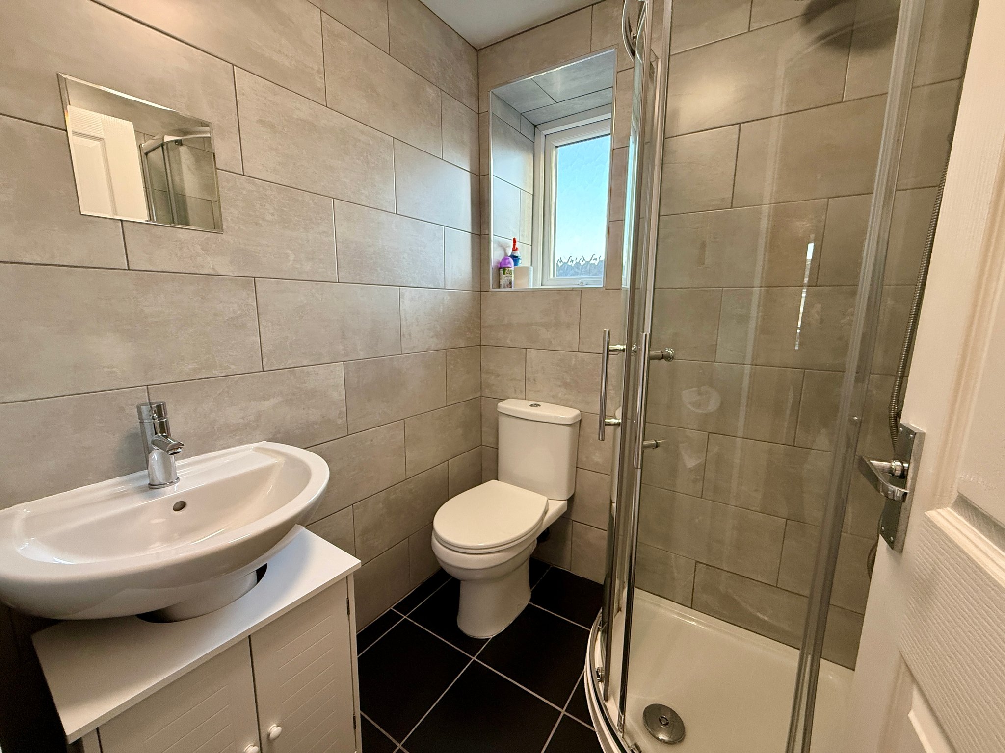 A modern three-piece white suite comprising of a walk-in shower unit, low level WC, wash hand basin with storage cupboard underneath, fully tiled walls and flooring, radiator and UPVC double glazed rear window.