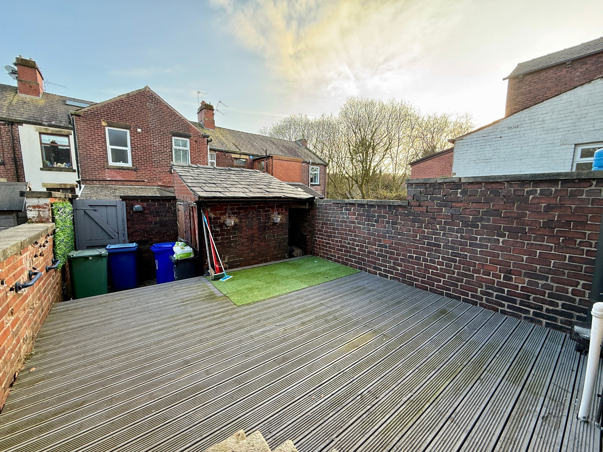 A decked enclosed rear yard, outside water tap, outhouses and gated access to the rear.