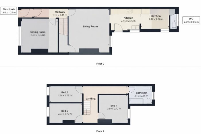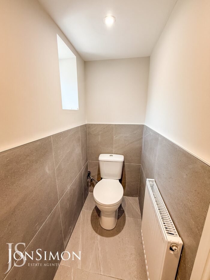 This kitchen is fitted with contemporary white cabinetry and grey worktops, paired with white subway tiles for a classic yet modern look. The layout is galley style, with ample workspace on both sides and a window to let in natural light. The flooring is a light tile, adding to the bright and fresh atmosphere. There is also a separate WC adjacent to the kitchen.