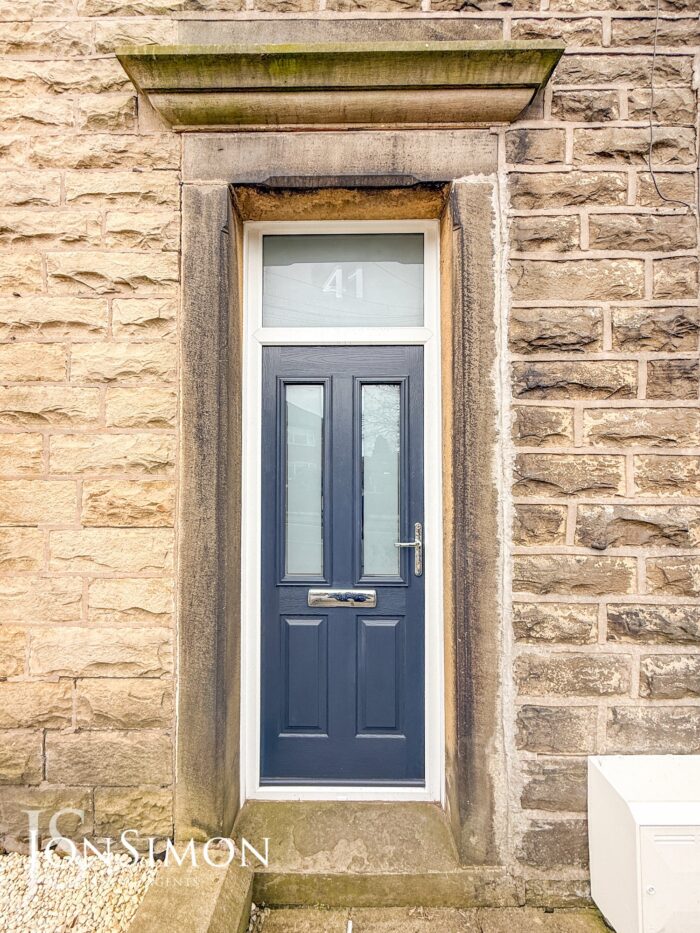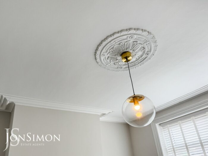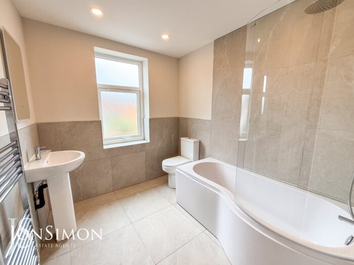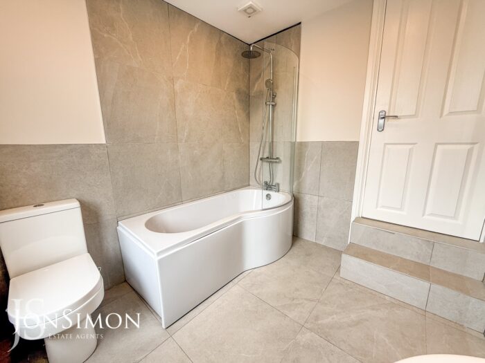 The family bathroom is fitted with a modern white suite comprising a bath with overhead shower, toilet and wash basin. The room is finished with large light grey tiles on the walls and contrasting white tiles on the floor, and benefits from a frosted window providing natural light and privacy.