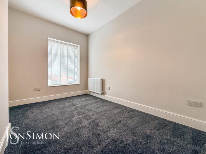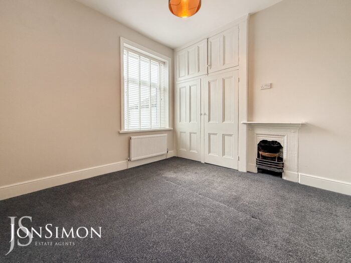 This light and airy living room features a large window that fills the space with natural light. It is finished with neutral tones and carpeted flooring.