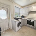 A modern range of wall and base units with complementary worksurface, four ring electric hob with extractor unit above, electric oven, plumbed for washing machine, single bowl sink unit with drainer, part tiled walls, radiator, ceiling point, UPVC double glazed window and UPVC double glazed back door.