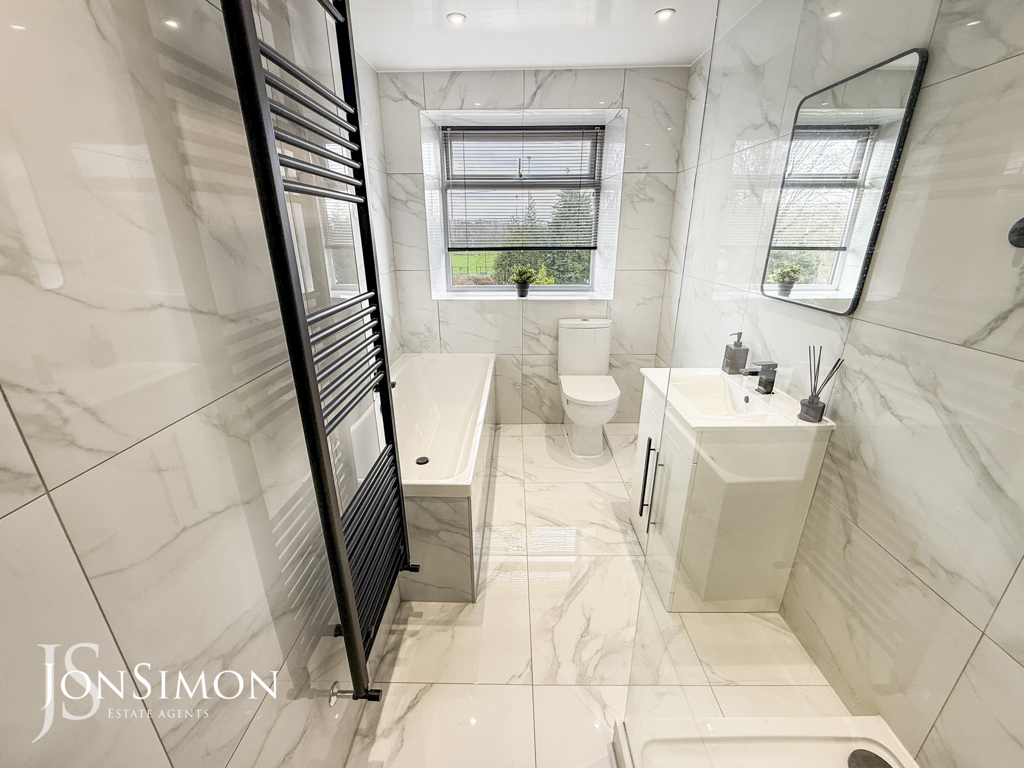 A superb four piece white bathroom suite comprising of a tiled bath with mixer tap, large walk-in shower unit, low level WC, wash hand basin with storage cupboard underneath, fully tiled flooring and walls, towel radiator, ceiling spotlights and UPVC double glazed rear window.