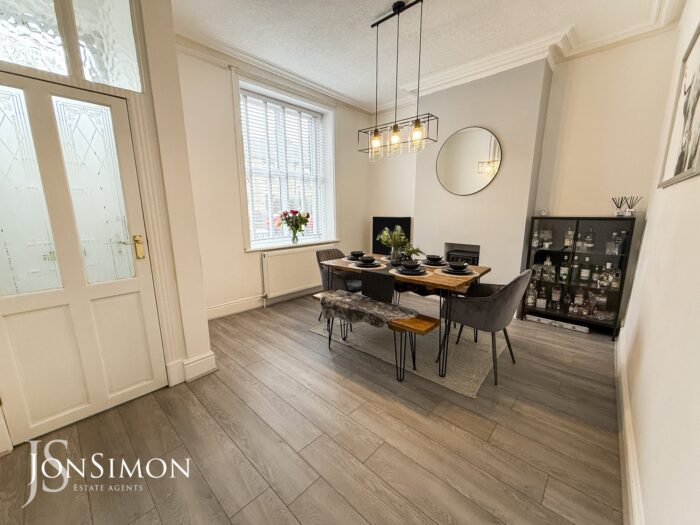 UPVC double glazed front radiator, ceiling coving, laminate flooring, ceiling point and stairs leading to the first floor landing. Floor access point for cellar.