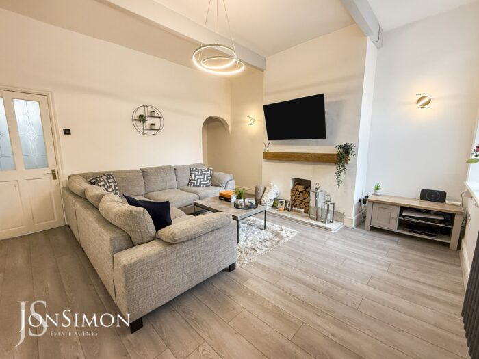 UPVC double glazed rear window, TV point, feature fireplace with solid wood mantelpiece, laminate flooring, radiator, wall lights, ceiling point, ceiling beams and access to the cellar.
