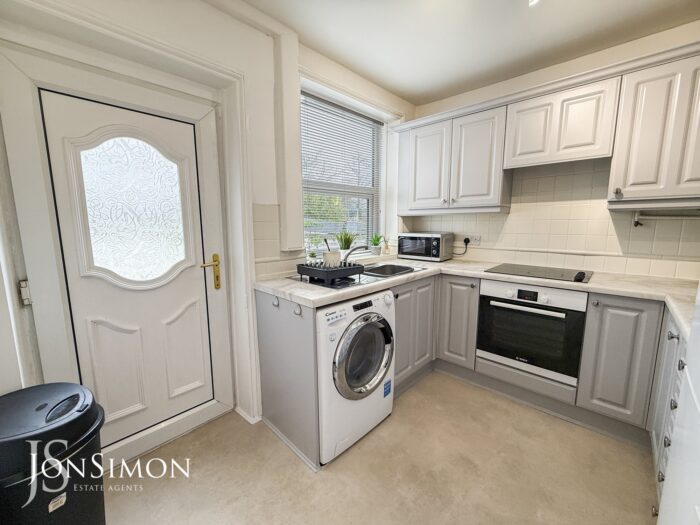 A modern range of wall and base units with complementary worksurface, four ring electric hob with extractor unit above, electric oven, plumbed for washing machine, single bowl sink unit with drainer, part tiled walls, radiator, ceiling point, UPVC double glazed window and UPVC double glazed back door.