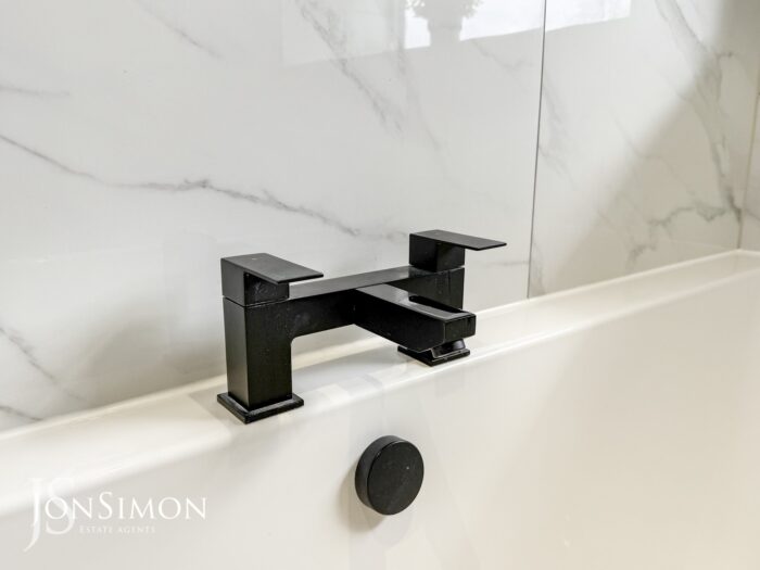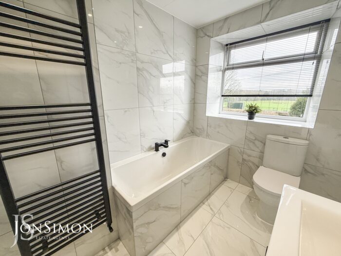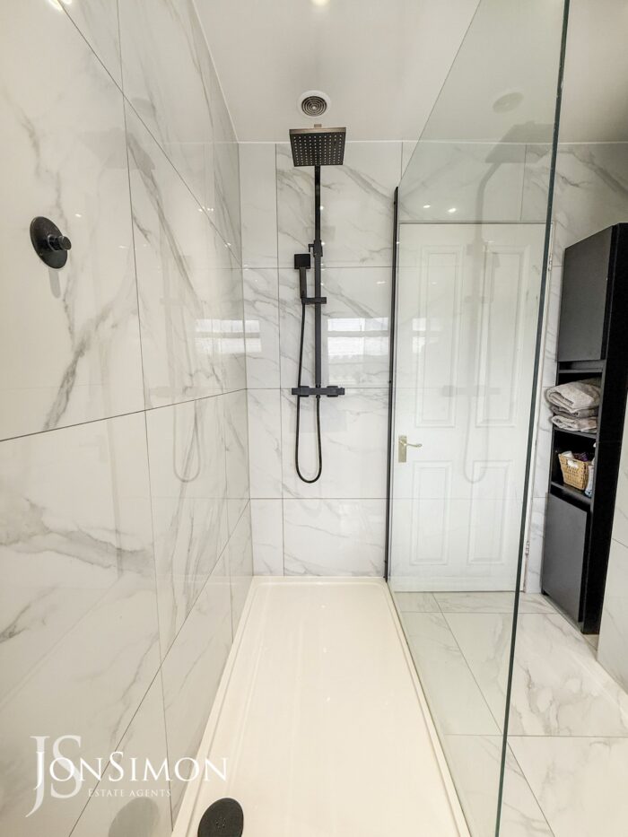 A superb four piece white bathroom suite comprising of a tiled bath with mixer tap, large walk-in shower unit, low level WC, wash hand basin with storage cupboard underneath, fully tiled flooring and walls, towel radiator, ceiling spotlights and UPVC double glazed rear window.