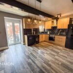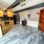 A range wall and base units were complementary worksurface, four rring electric hob with extractor unit, electric oven, single sink unit with drainer, plumbed for washing machine and dishwasher, part tiled walls, radiator, ceiling point, wall lights, TV point , UPVC double glazed rear window and UPVC double glazed French patio doors.