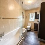 A three-piece bathroom suite comprising of a P-shaped bath with shower above, low level WC, wash hand basin with storage cupboard and fully tiled walls, radiator, ceiling point and UPVC double glazed window.