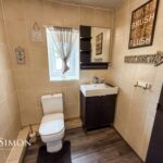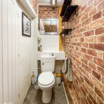 A two piece white suite composing of low level WC, wash hand basin, part tiled walls, storage cupboard under the stairs and ceiling point.