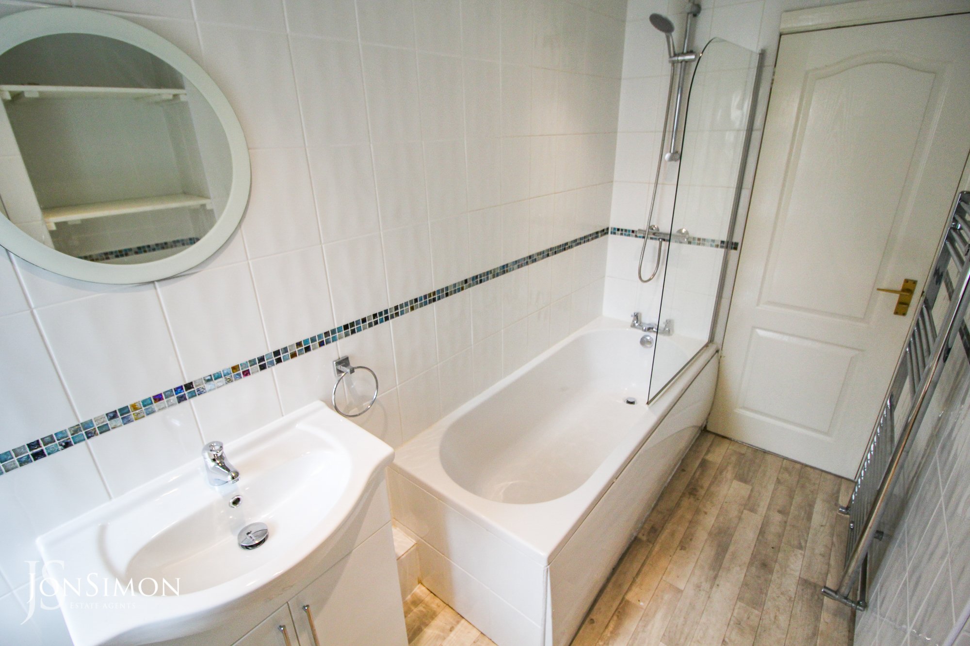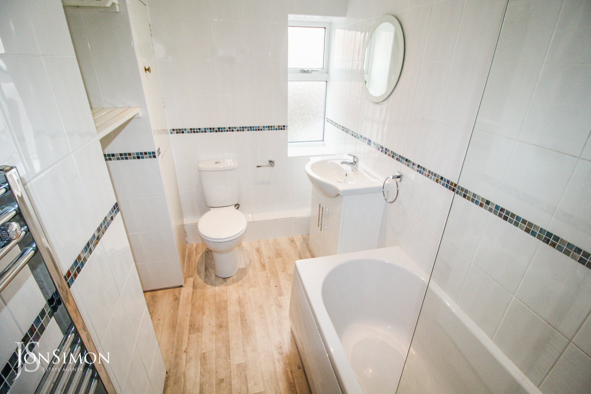 A modern three piece white bathroom suite comprising of a panel bath with shower above, glass shower screen, low level w/c, wash hand basin, fully tiled walls, radiator, ceiling point and UPVC double glazed rear window.