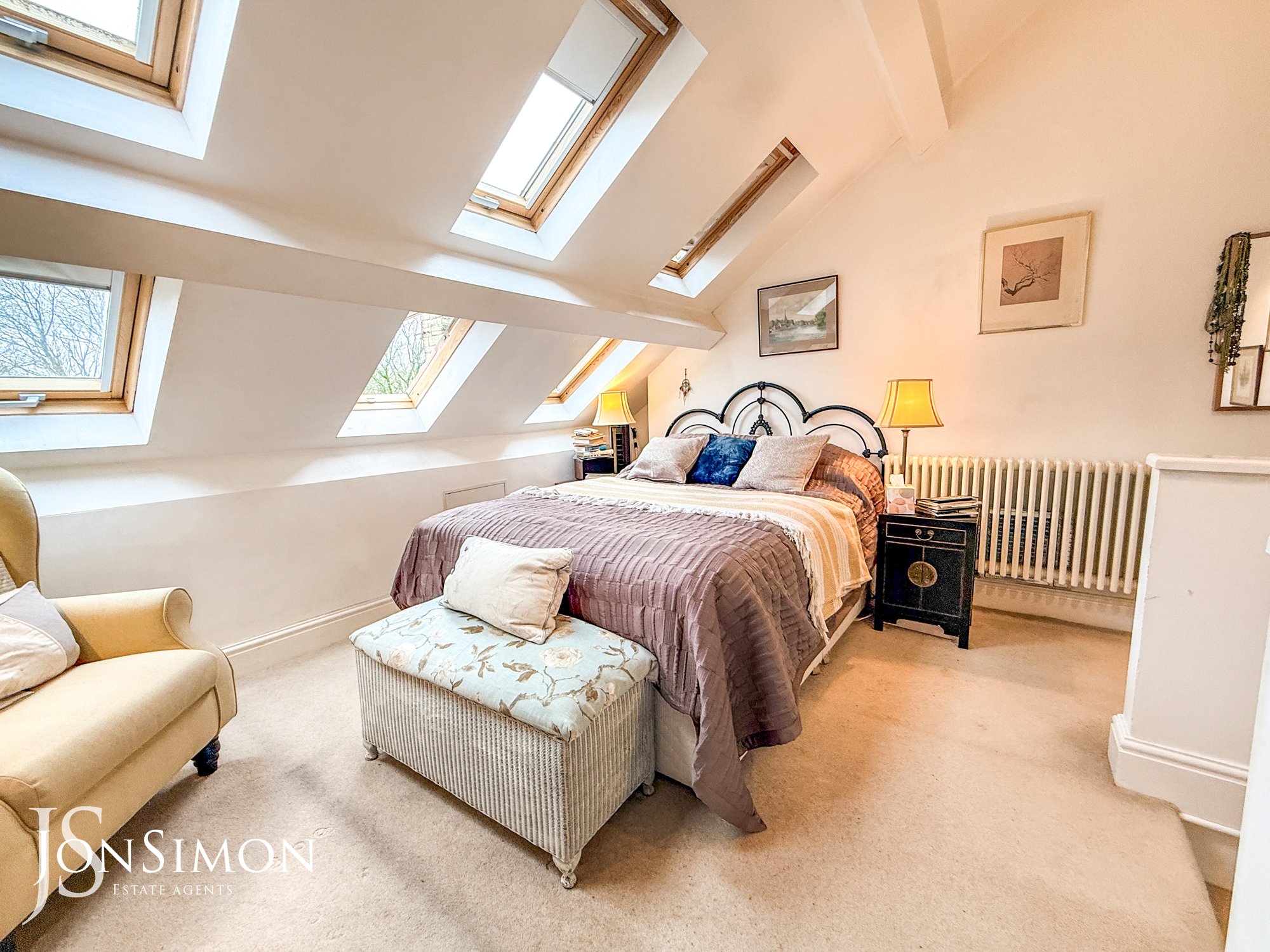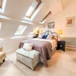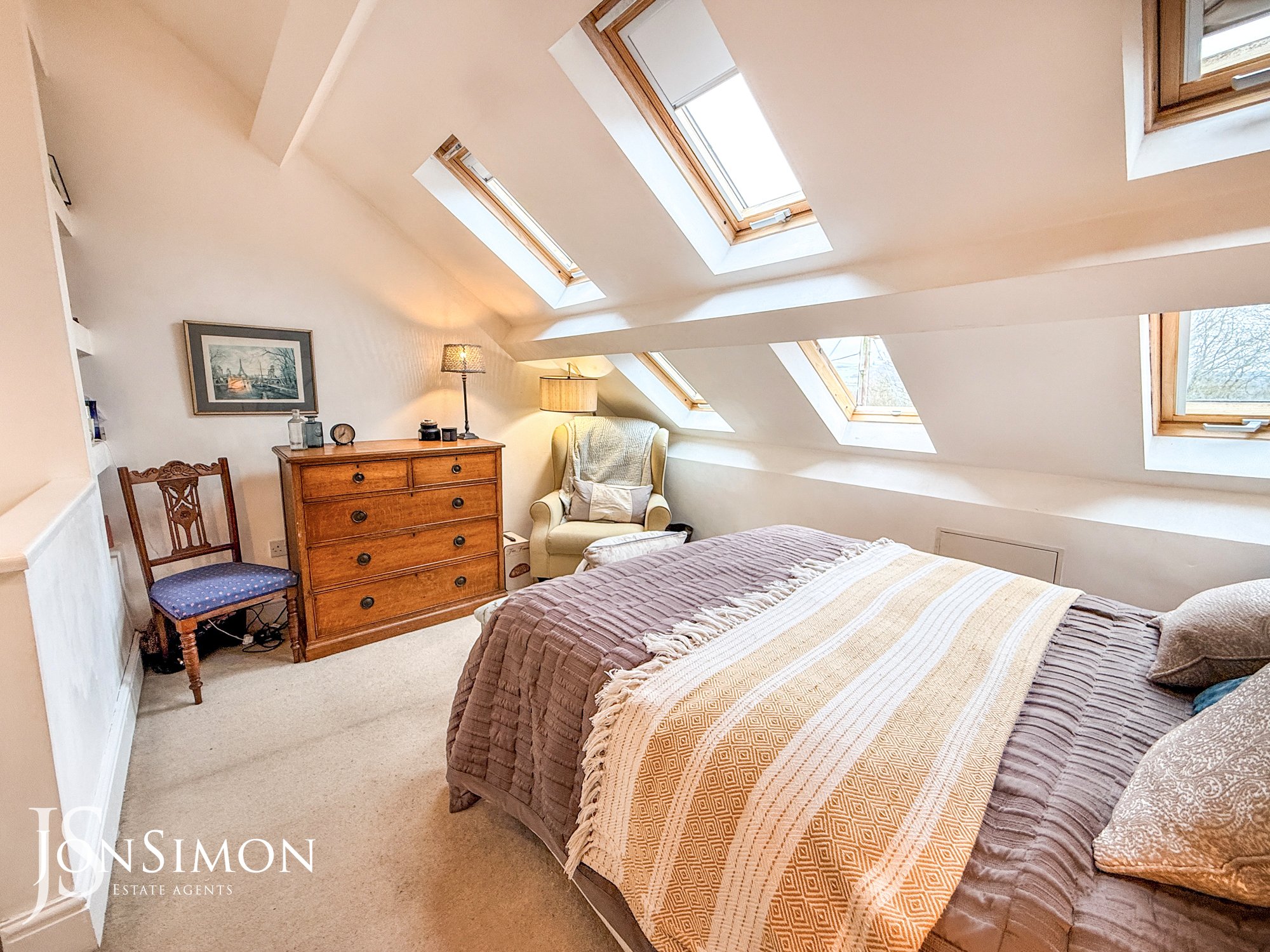 With fitted carpets to the stairs and bedroom, ceiling light point, 6 double glazed sky light windows, wall mounted radiator, built in nook shelving, and storage cupboard.