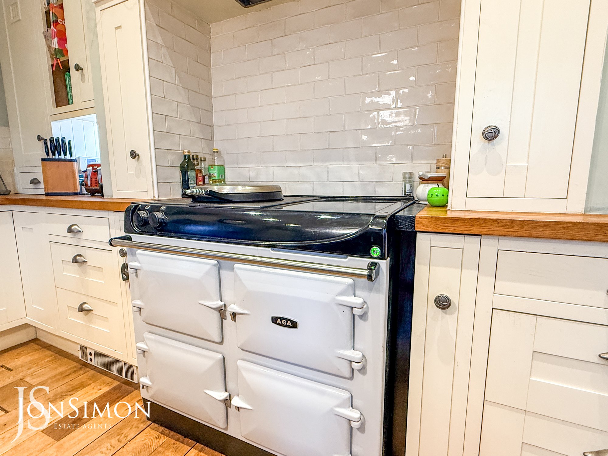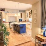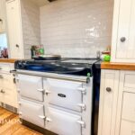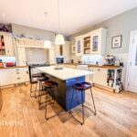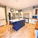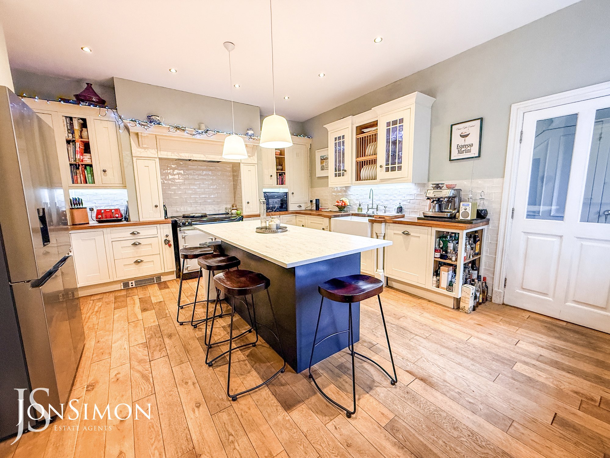 With spotlight lighting, two over island pendant lights, solid wood flooring, wood framed double glazed sash window, splashback tile, wall and base units, under unit lighting, kitchen island with bar seating, double Belfast sink with pot wash attachment, integrated dishwasher, modern AGA with induction hob, and archway opening to lounge area.