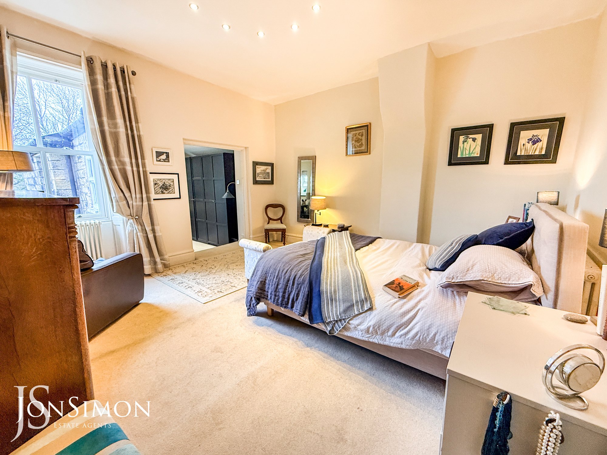 With fitted carpets, spotlight lighting, two wall mounted radiators, and wood framed double glazed sash window.