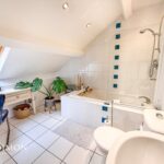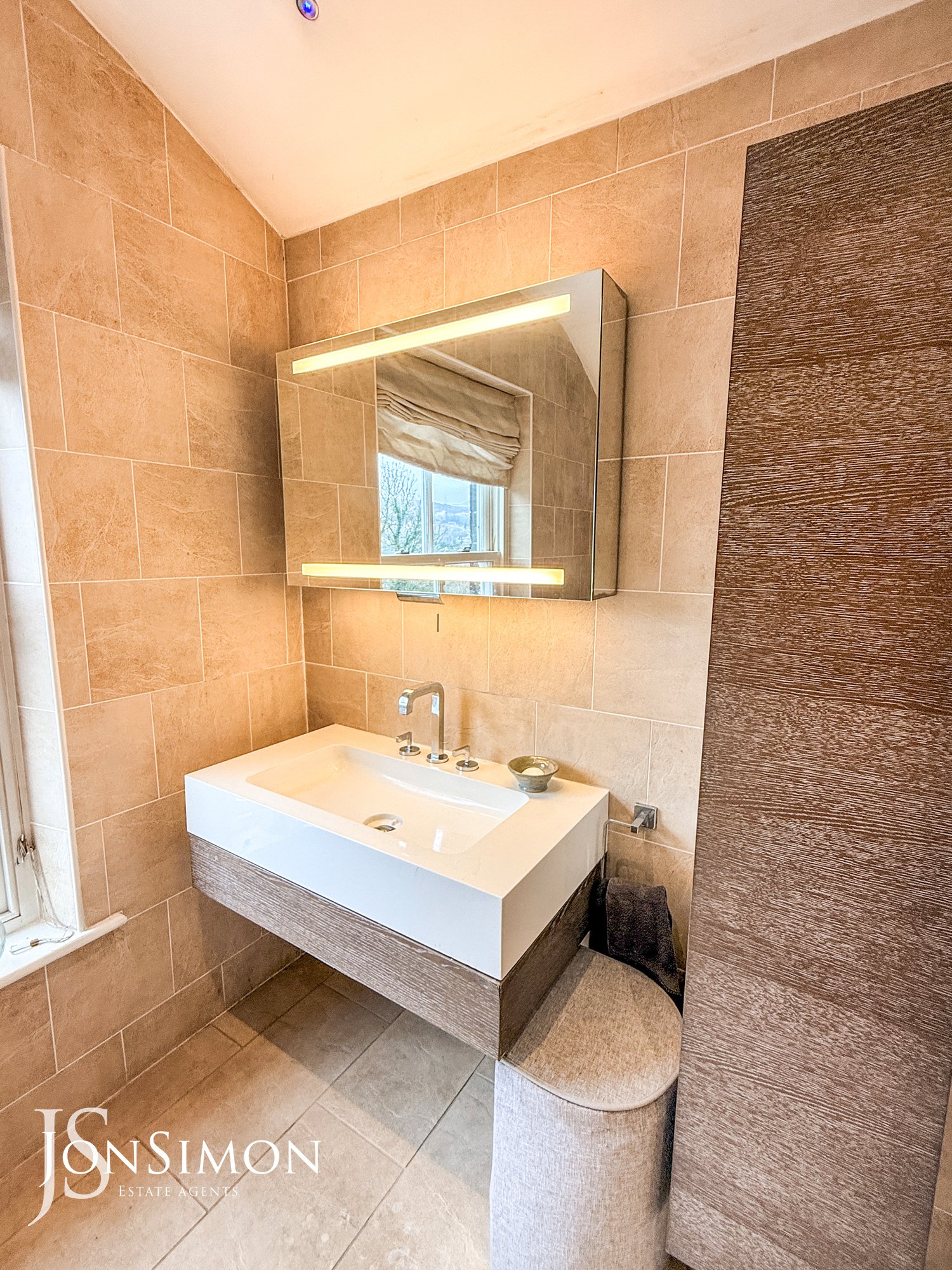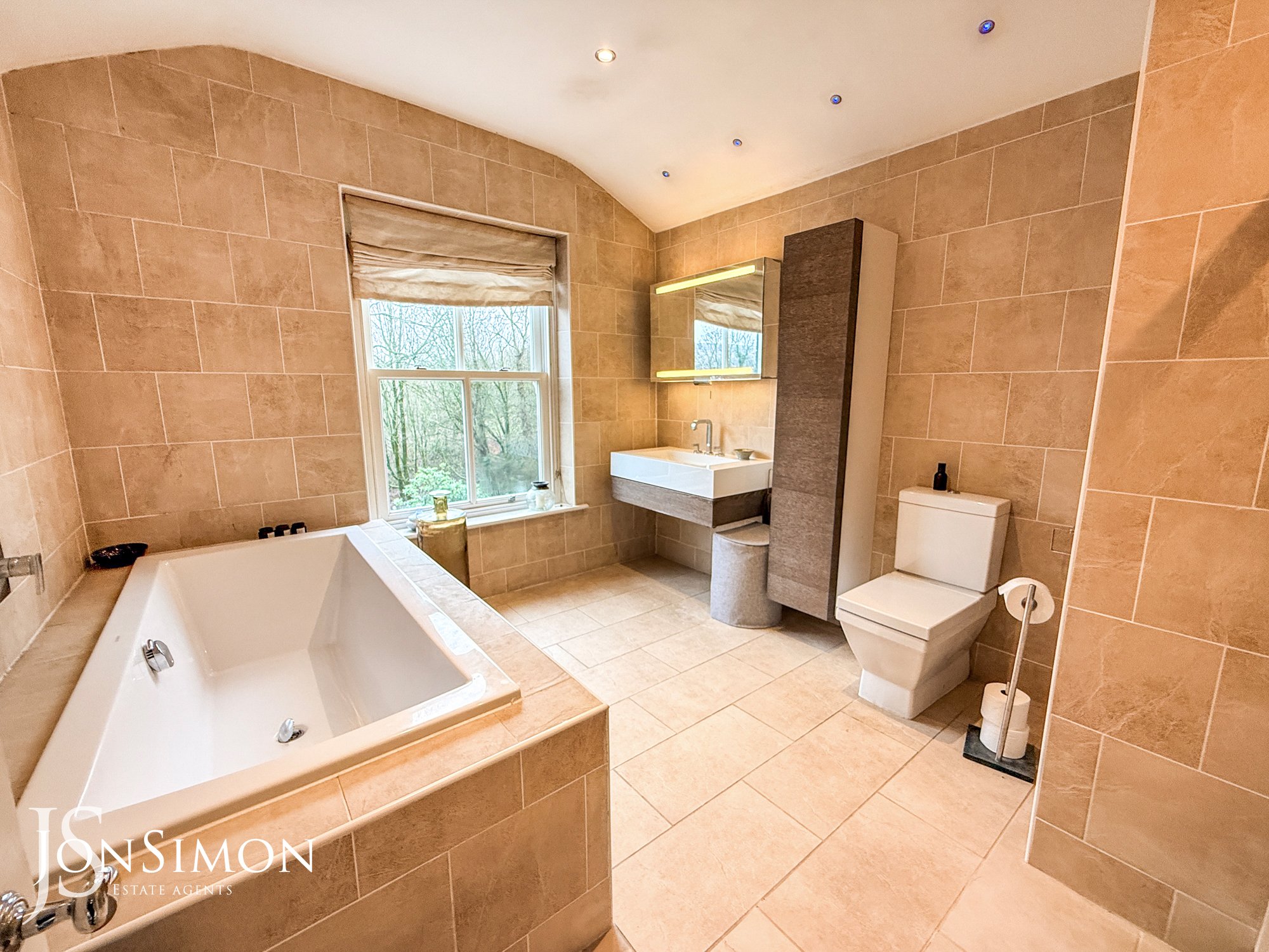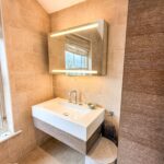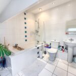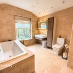 With extractor fan, heated towel rail, full floor and wall tile, spotlight lighting, wood framed double glazed sash window, built in shelving, fitted wall cupboard, mirrored vanity cupboard, and 4 piece suite of WC, basin, walk-in shower, and bath.