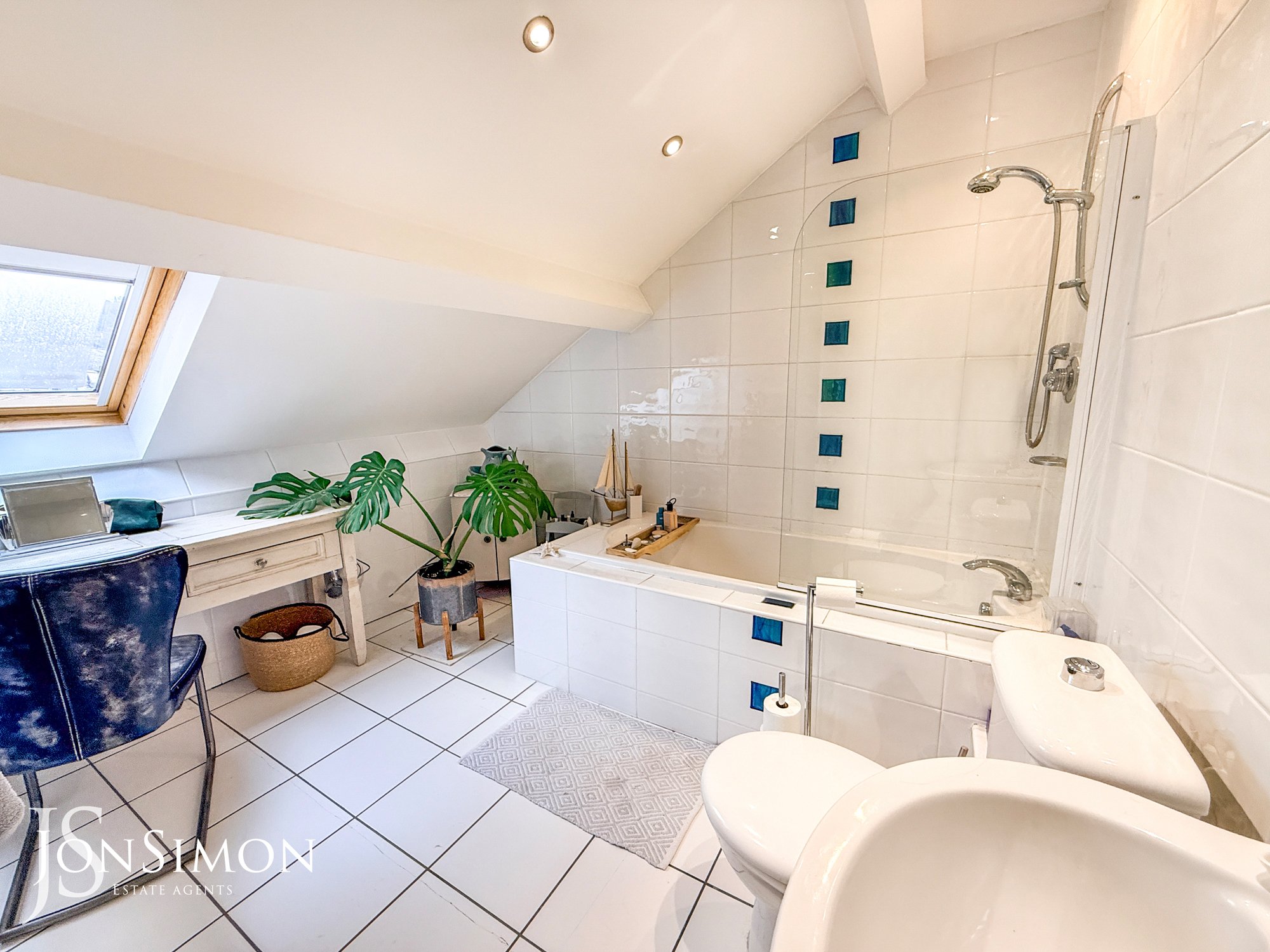 With full wall and floor tile, heated towel rail, double glazed sky light window, spotlight lighting, extractor fan, and 3 piece suite of WC, basin, and bath with shower and glass screen.