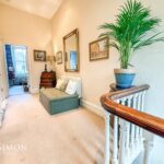With fitted carpets to stairs and landing, wooden hand rail and balustrade, spotlight lighting, over stairs light fixture, and large feature double glazed window.