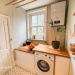 With floor tile, wood framed double glazed sash window, fitted counter top, plumbing for washer dryer, ceiling pulley clothes airer, and wall mounted combi boiler.