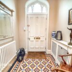 With solid wood front door with glazed fanlight above, wall mounted radiator, tiled flooring, spotlight lighting, and wooden door frame with glazing to both sides leading to the hallway.