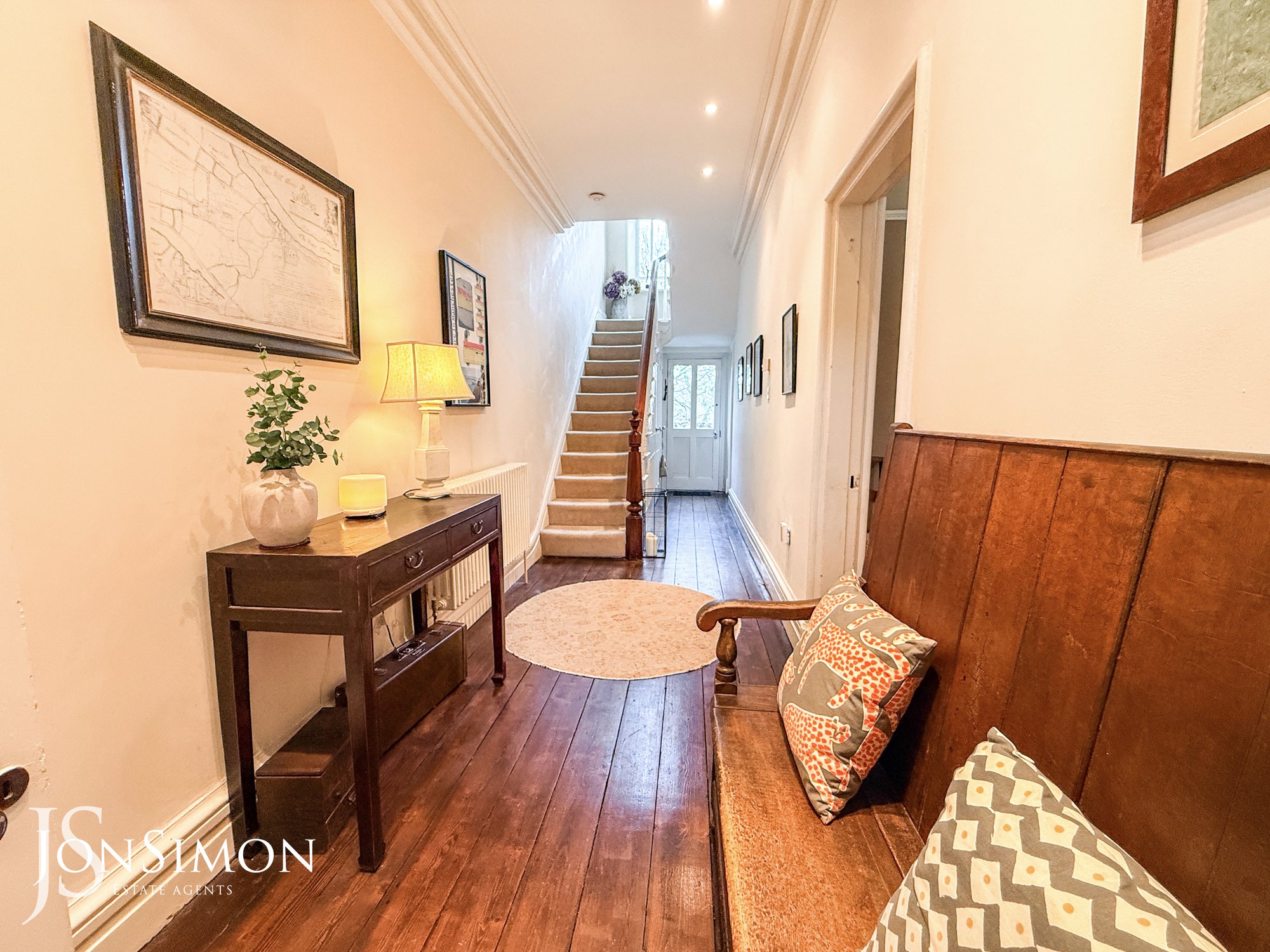 With solid wood flooring, wall mounted radiator, decorative coving, spotlight lighting, and stairs to the storage cellar.