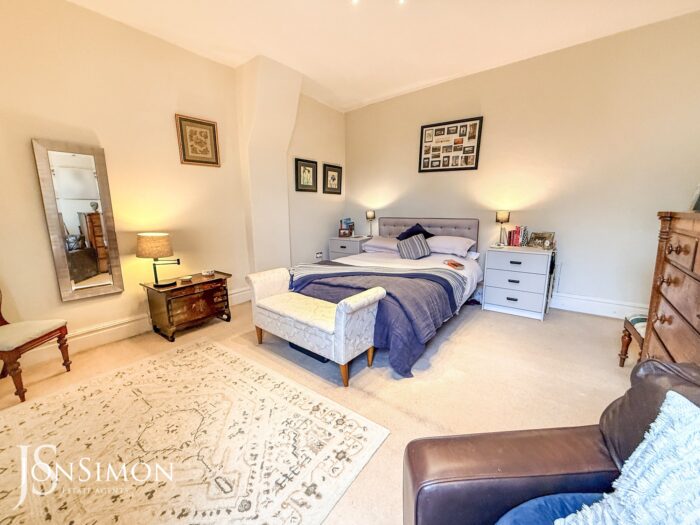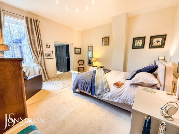 With fitted carpets, spotlight lighting, wall mounted radiator, wood framed double glazed sash window, and built in cupboards, wardrobe, and shelving.