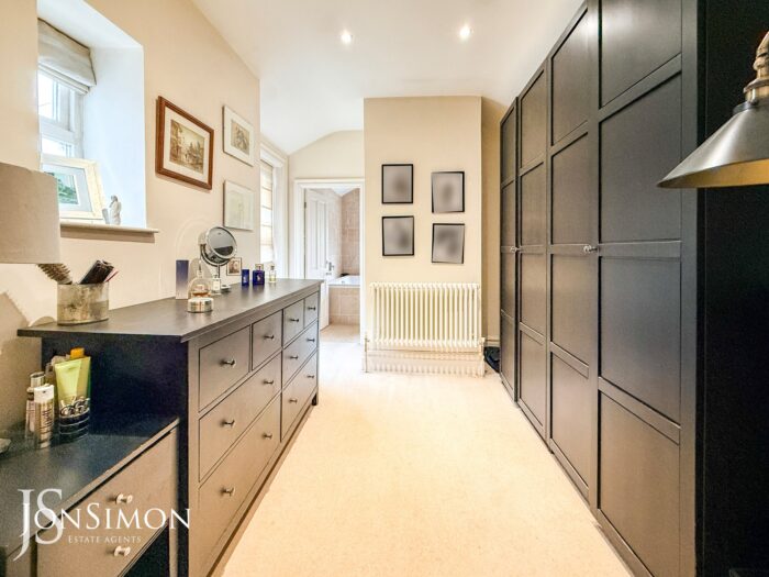 With extractor fan, heated towel rail, full floor and wall tile, spotlight lighting, wood framed double glazed sash window, built in shelving, fitted wall cupboard, mirrored vanity cupboard, and 4 piece suite of WC, basin, walk-in shower, and bath.