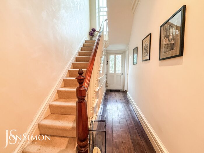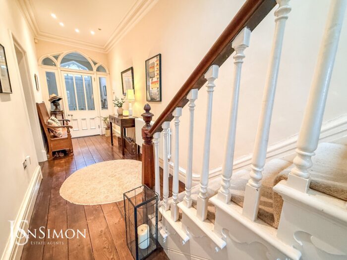 With solid wood flooring, wall mounted radiator, decorative coving, spotlight lighting, and stairs to the storage cellar.