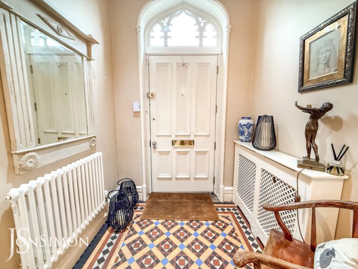 With solid wood front door with glazed fanlight above, wall mounted radiator, tiled flooring, spotlight lighting, and wooden door frame with glazing to both sides leading to the hallway.
