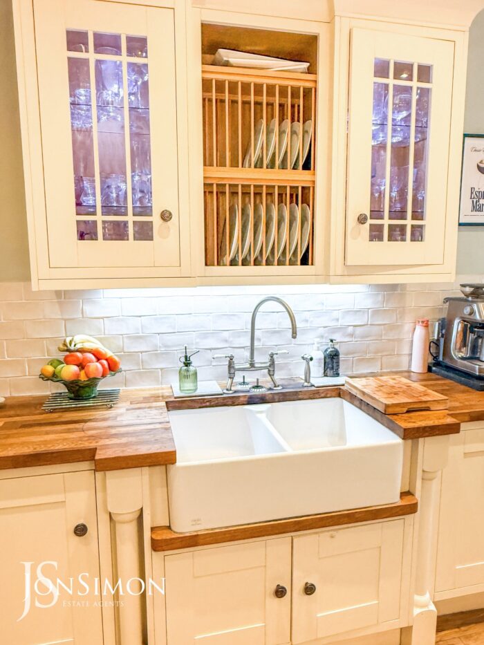 With spotlight lighting, two over island pendant lights, solid wood flooring, wood framed double glazed sash window, splashback tile, wall and base units, under unit lighting, kitchen island with bar seating, double Belfast sink with pot wash attachment, integrated dishwasher, modern AGA with induction hob, and archway opening to lounge area.