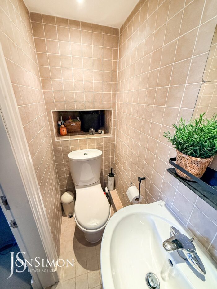 With full wall and floor tile, spotlight lighting, extractor fan, storage nook, and 3 piece suite of WC, basin, and walk-in shower.