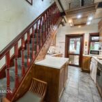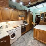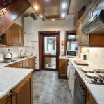 A range of wall and base units with complementary worksurface, four ring electric hob with extractor unit above, electric oven, fridge, freezer, dishwasher and washing machine, part tiled walls, one and a half bowl sink unit with drainer, tiled flooring, combi boiler, radiator, ceiling points, ceiling beams, stairs leading to the first floor landing, UPVC double glazed rear window and rear door.