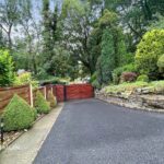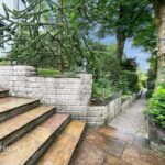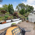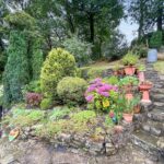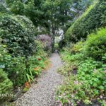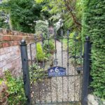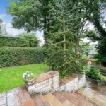 Front: Long pebbled pathway, gated access, well established borders and shrubs, paved area, lawn and trees.