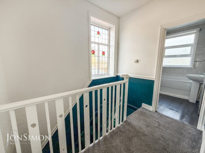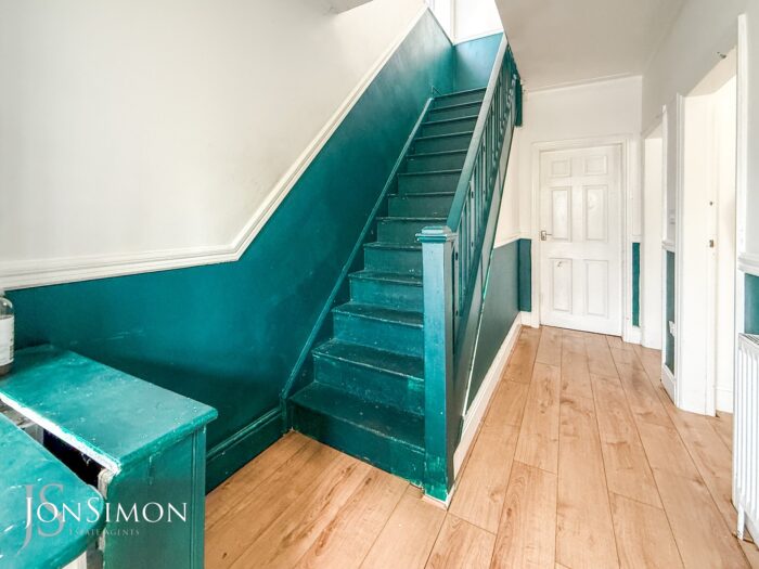 Radiator, ceiling coving, laminate flooring and stairs leading to the first floor landing.